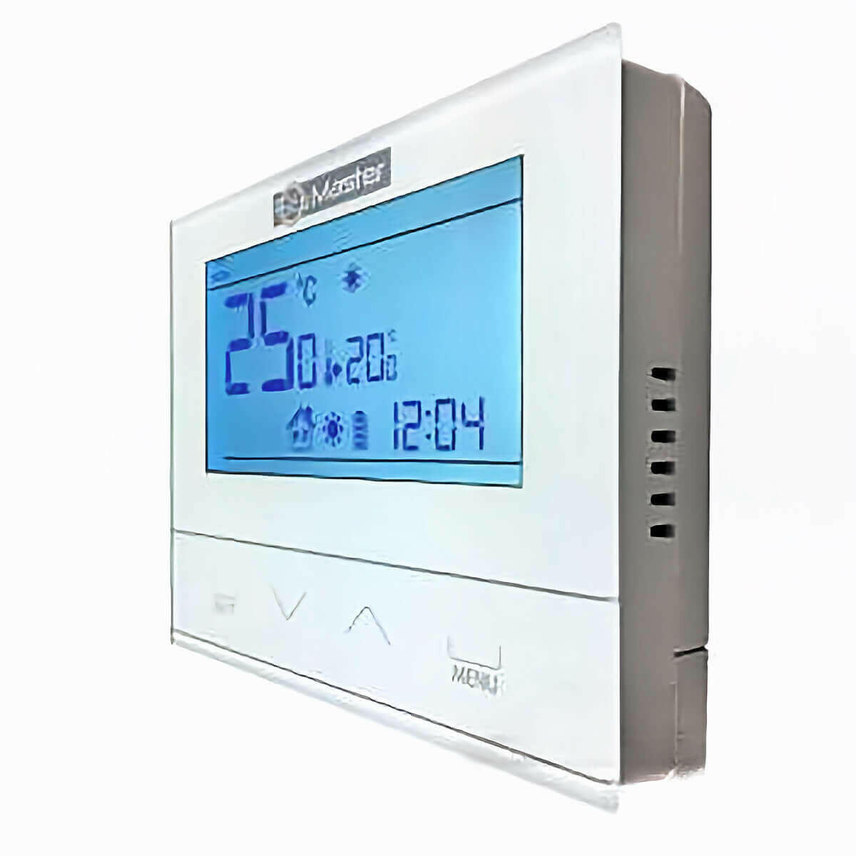 El controlador de ambiente Master R.23 le ofrece una solución práctica y eficiente para controlar sus aparatos de calefacción. Con su control semanal integrado, su diseño elegante y su fácil manejo, este termostato es ideal para espacios residenciales y comerciales. Su montaje en pared es rápido y sencillo gracias a su diseño de superficie.