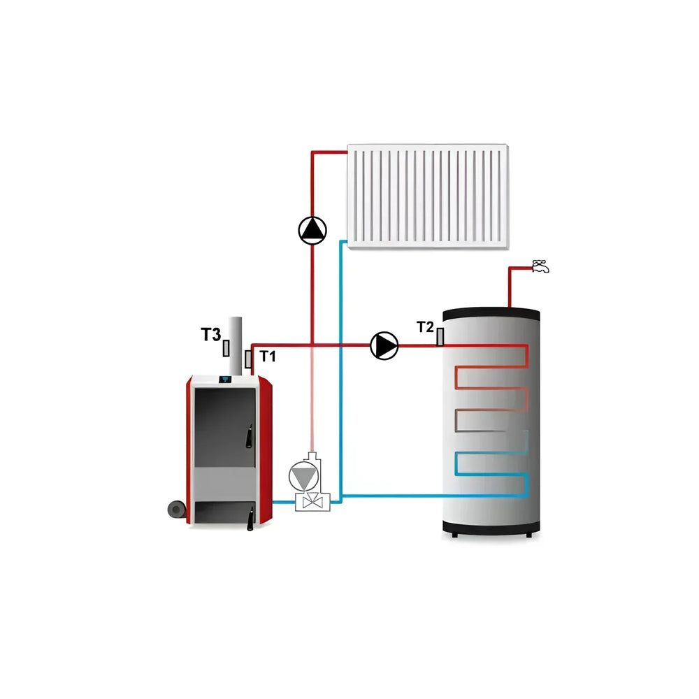 La protezione termica integrata previene il surriscaldamento, mentre il sensore dei fumi ottimizza l'efficienza della caldaia e aumenta la sicurezza. Inoltre, il controller è dotato di sensori resistenti con un intervallo di temperatura da -25 °C a 90 °C, che lo rendono particolarmente robusto e affidabile.