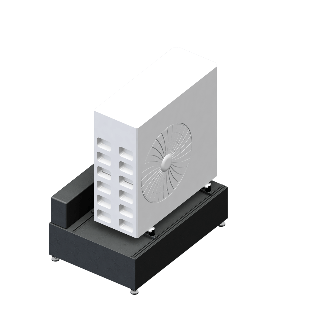 Este proiectat pentru instalare în exterior. Servește ca bază pentru pompa de căldură (max. 150 kg). Aceste caracteristici îl fac unic și exclusiv, eliminând definitiv nevoia de spațiu interior suplimentar. Vine pre-echipat cu kitul antivibrații pentru pompa de căldură. Este pregătit pentru instalarea vasului de expansiune folosind kitul special furnizat separat.